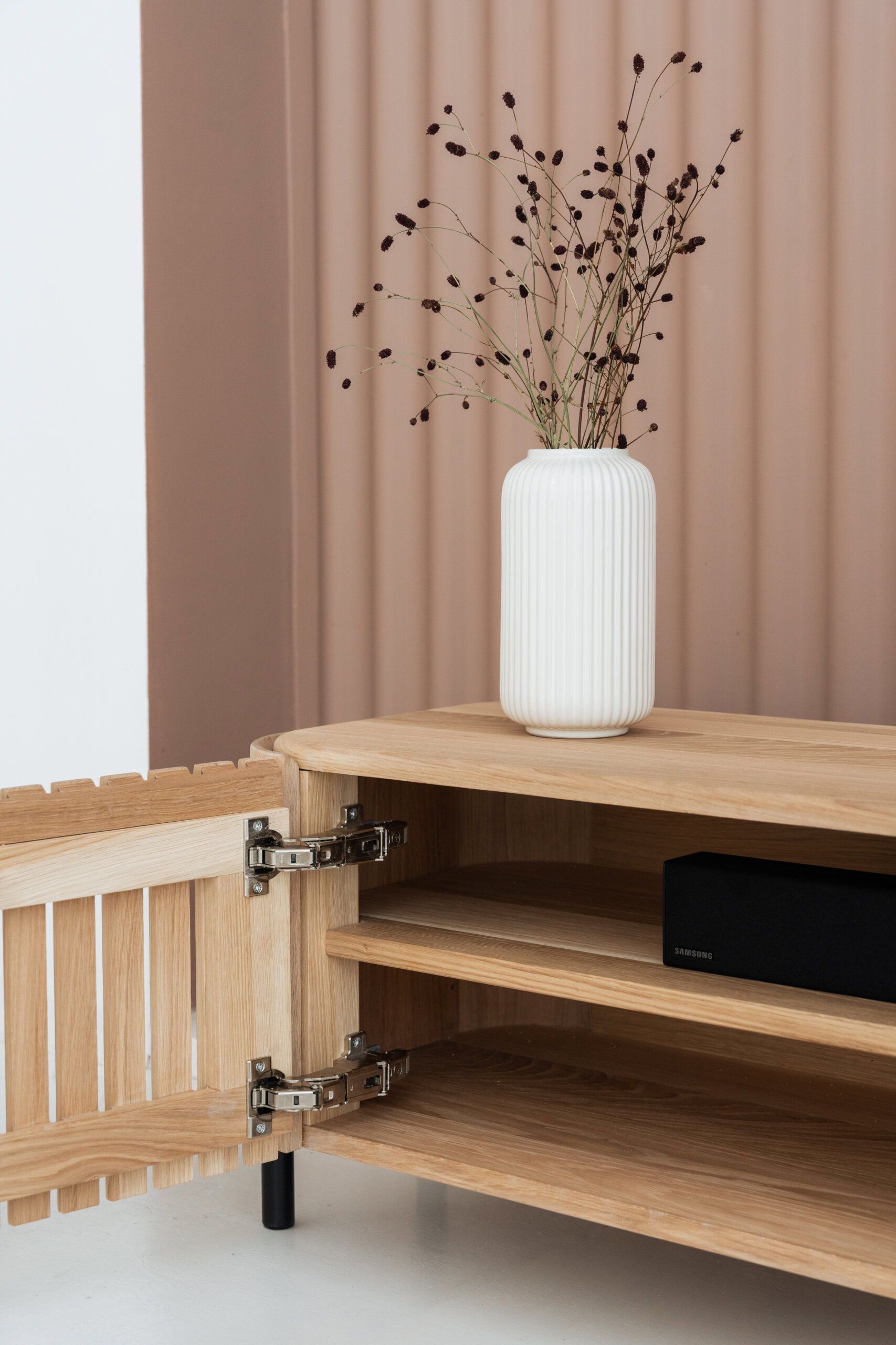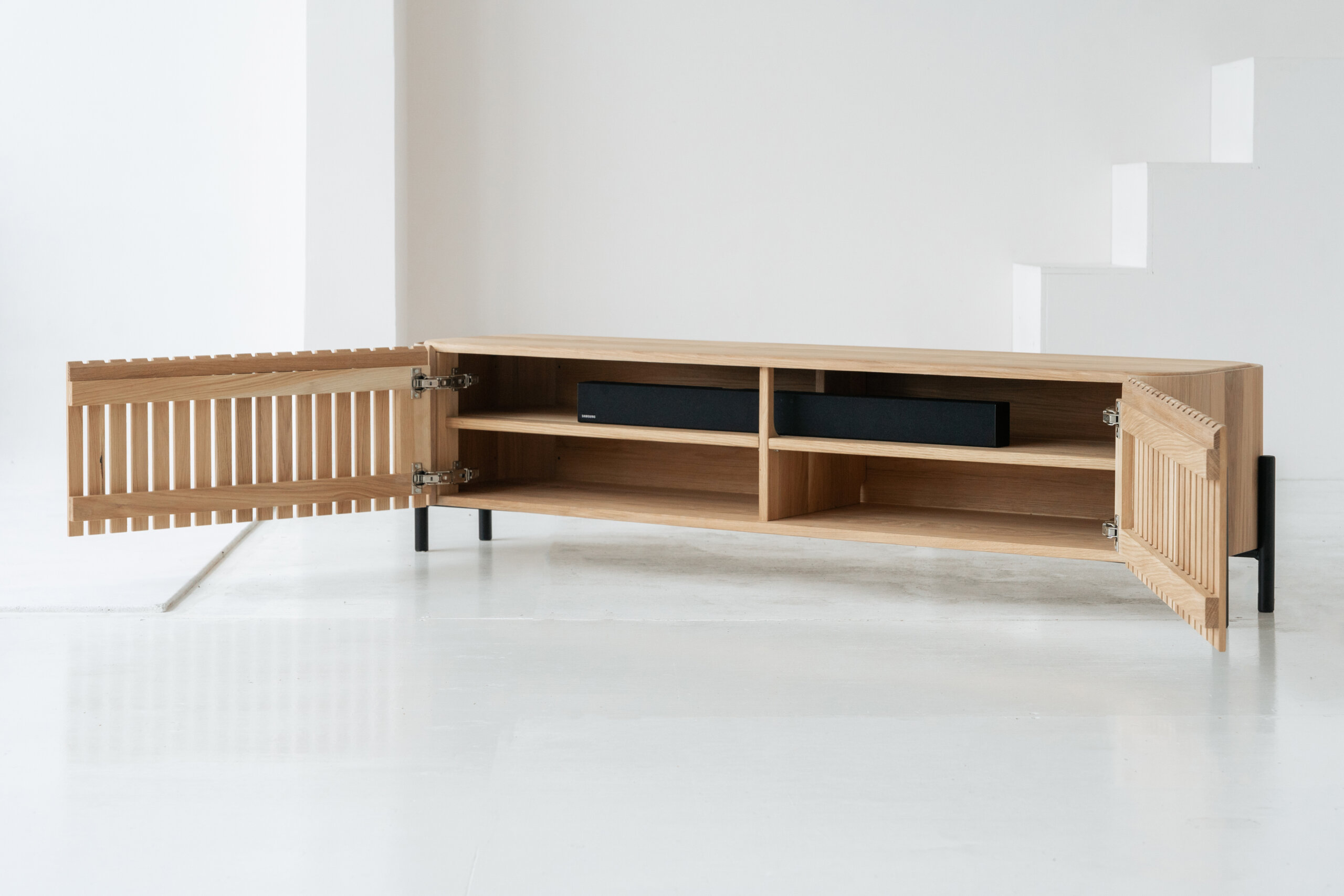 Miejsce na głośnik soundbar – specjalnie zaprojektowana wnęka pozwala ukryć sprzęt audio, chroniąc go przed kurzem i zapewniając nowoczesny wygląd.