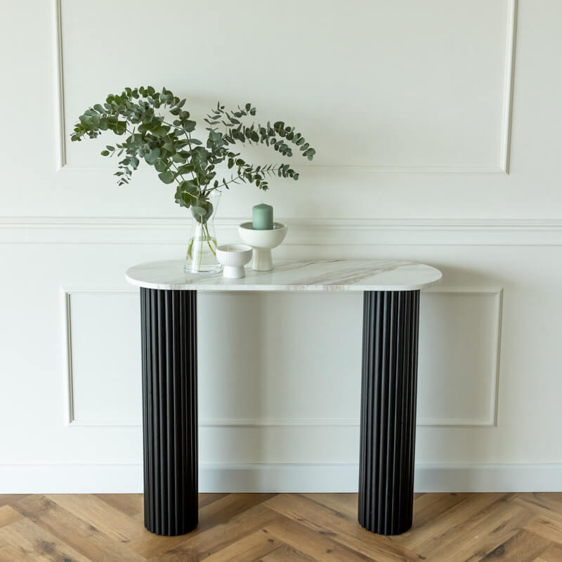 Marmurowa konsola z białym lub czarnym wybarwieniem. Ryflowane nogi na których opiera się marmurowy blat tworzą razem prostą, ale ponadczasową formę. Konsola wykonana jest wykonana z najwyższej jakości materiałów. Każdy element jest solidnie wyselekcjonowany, aby każdy element zaskakiwał swoją jakością.